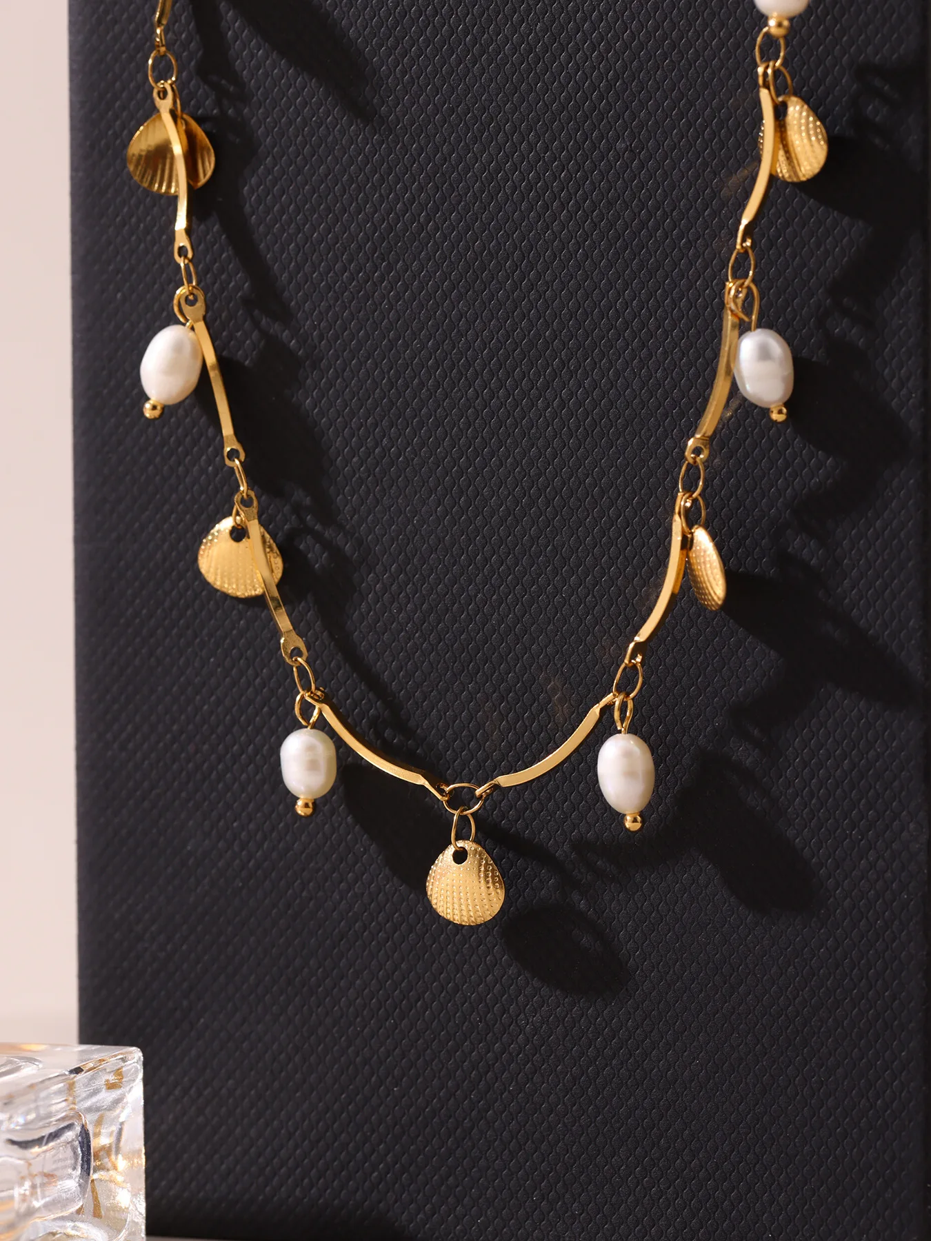 This elegant necklace showcases an 18K gold-plated stainless steel shell pendant complemented by natural freshwater pearls. Designed for durability and refined aesthetics, it offers a sophisticated accessory choice for women who appreciate enduring quality and graceful style.